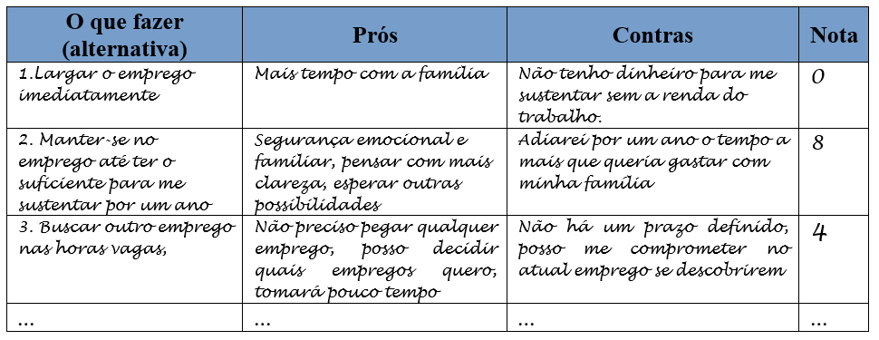 Ao fazer uma tabela semelhante, você terá mais clareza sobre cada alternativa. Faça isso com todas as alternativas que levantou, não tenha preguiça, coloque no papel, com sua letra. Depois você pode fazer uma lista por ordem decrescente a partir da nota maior(que você acha mais eficiente e possível de executar). Por fim, pegue as alternativas com as notas mais altas e anote as etapas para executá-la: